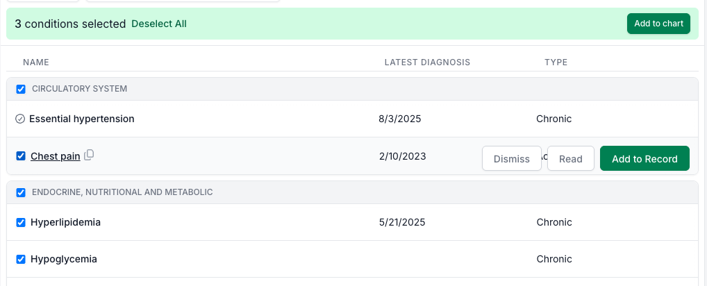 You can add Conditions from Zus to the Elation Problem list using the "add" button that appears when hovering over an item on the conditions list, or in bulk by selecting multiple conditions using the check box to the left of each condition.
