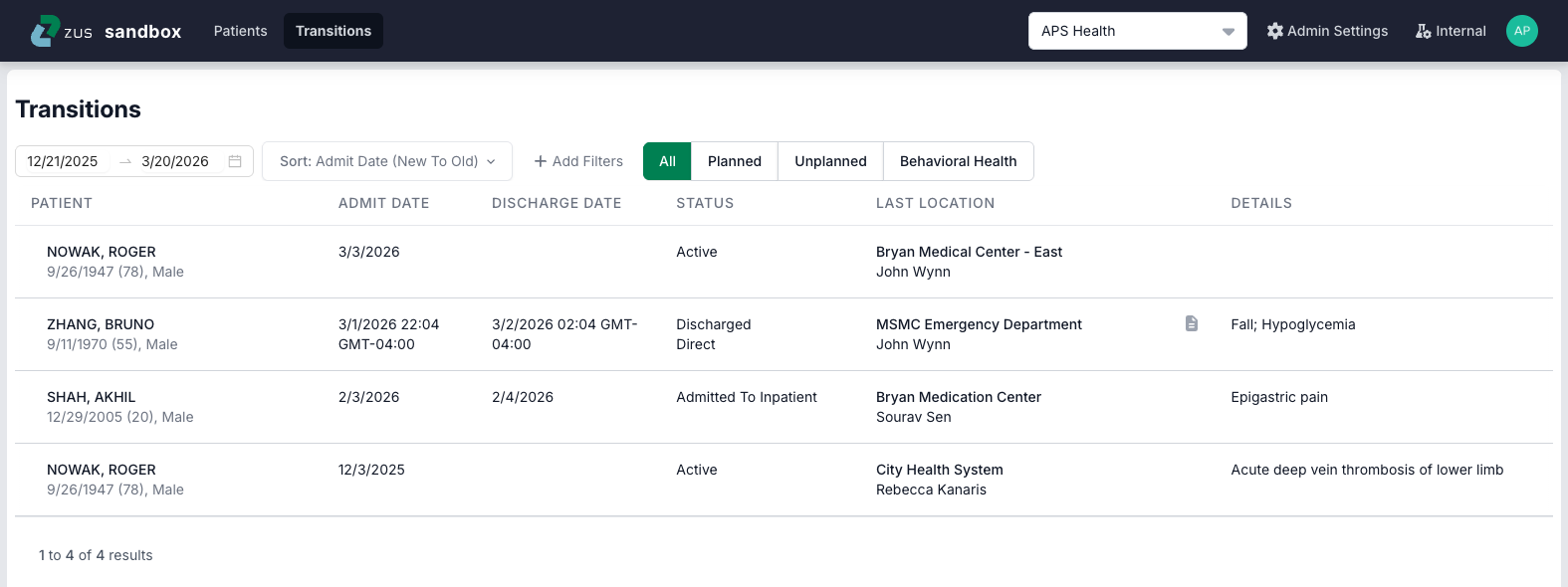 The Zus Transitions page provides a list of patients that have had recent encounters at hospitals.