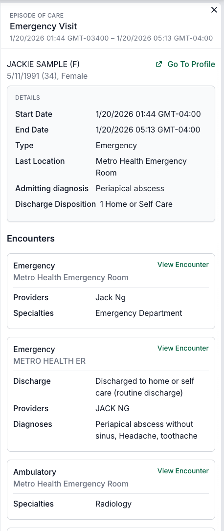 - Discharge Disposition If the patient has been discharged, the setting the patient was discharged to following their episode is displayed if available.